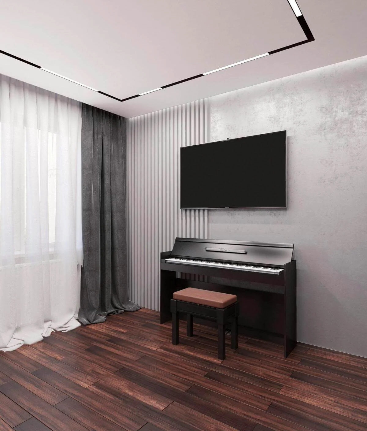 Стены обработаны мебельными панелями и декоративной штукатуркой, что придает разнообразие фактур и натуральность в пространстве